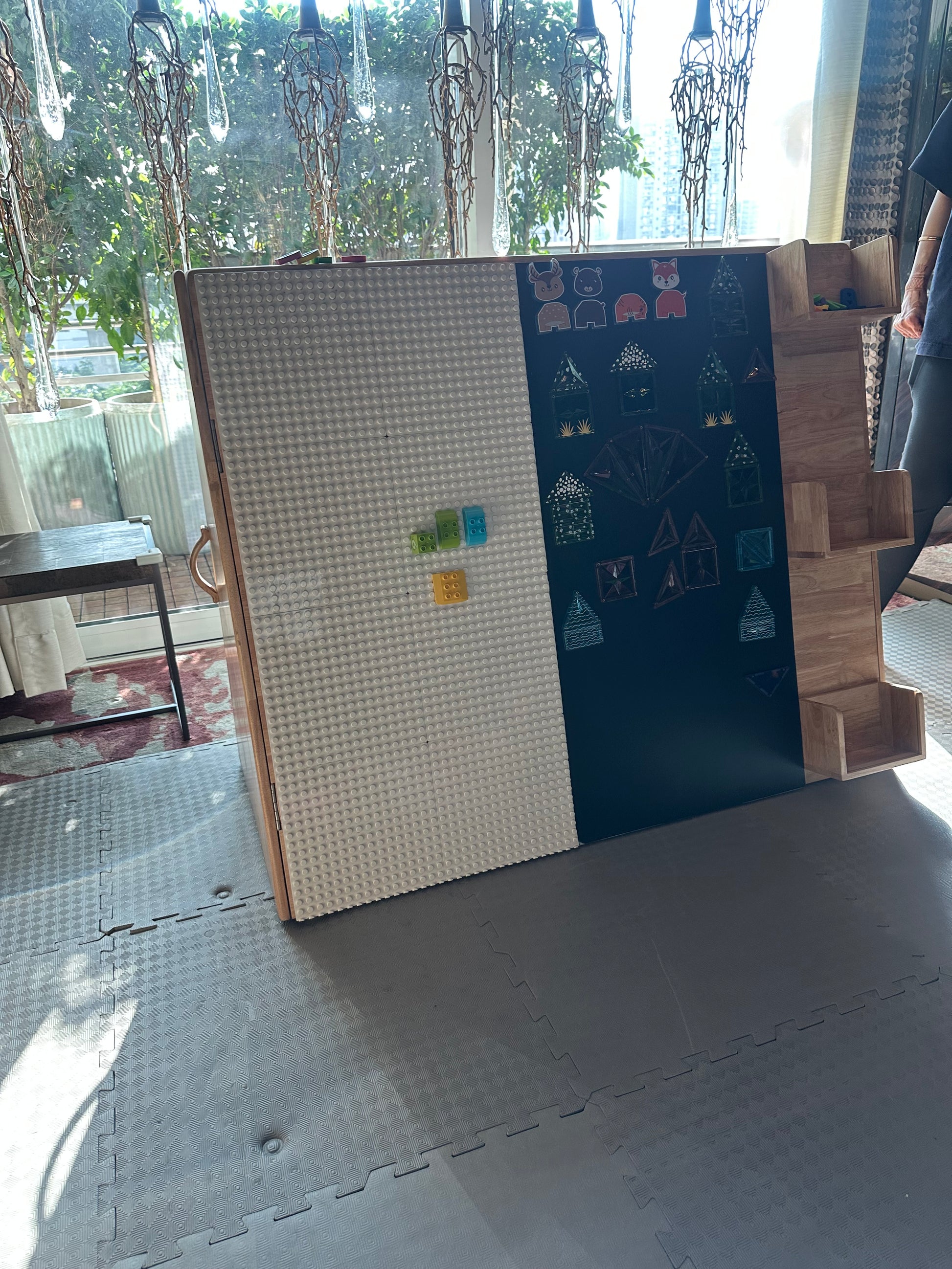 A wooden activity station featuring a magnetic whiteboard, blackboard, and a Lego board — perfect for doodling, writing, and building. The center storage space neatly fits toy and Lego boxes, keeping everything organized and within reach. A clean, functional setup that encourages creative, open-ended play every day for kids.